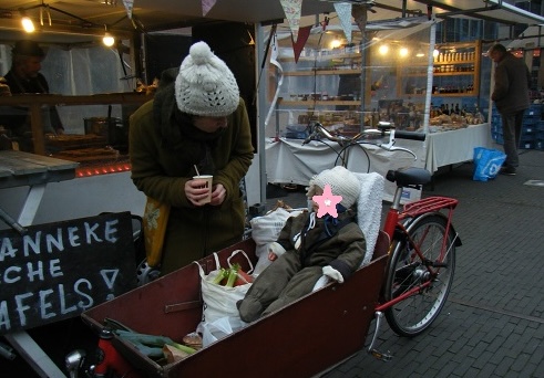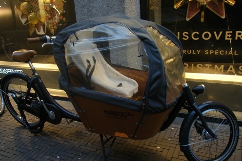 オランダの自転車道では、自転車、バイク、そしてこのカーゴバイク(オランダ語でBakfiets)がブンブン飛ばしてくるので、くれぐれもお気をつけてくださいね!